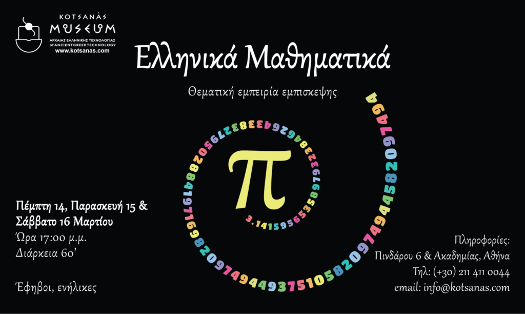 Το Μουσείο Κοτσανά Αρχαίας Ελληνικής Τεχνολογίας γιορτάζει την Παγκόσμια Ημέρα της Σταθεράς π μέσα από ένα ξεχωριστό ταξίδι ανακάλυψης του μαθηματικού κόσμου που μας περιβάλλει. Προορισμός μας, τα αρχαία ελληνικά μαθηματικά και ενδιάμεσοι σταθμοί, η ιστορία, η τεχνολογία και η σύγχρονη μαθηματική πραγματικότητα.