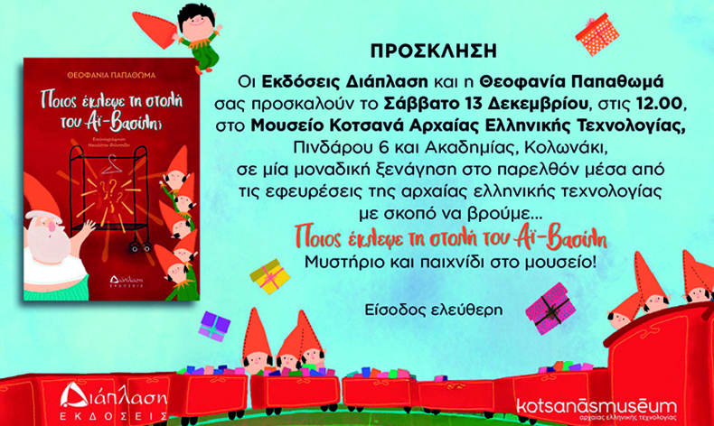 Το Μουσείο Κοτσανά Αρχαίας Ελληνικής Τεχνολογίας στην Αθήνα προσκαλεί τους φίλους του – μικρούς και μεγάλους – σε μια ξεχωριστή γιορτινή δράση, που πραγματοποιείται σε συνεργασία με τις Εκδόσεις Διάπλαση και τη Θεοφανία Παπαθωμά, το Σάββατο 13 Δεκεμβρίου και ώρα 12.00.