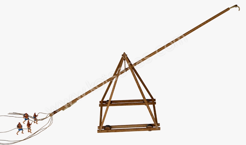 It was a tall scaffold on wheels from which a long wooden beam was suspended. The front end of the beam had a metal hook or grab. The operators, with ropes fastened to the rear end of the beam, led the hook to a stone at the top of the enemy wall and once they had grabbed it, they pulled the ropes with force, pulling it down. In this way, they demolished the enemy wall from top to bottom.