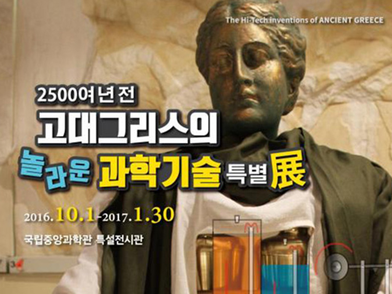 Στις 30-9-16 εγκαινιάστηκε η περιοδεύουσα έκθεση με τίτλο «Oι Hi-Tec εφευρέσεις των αρχαίων Ελλήνων: οι απαρχές της σύγχρονης τεχνολογίας μας» σε ένα από τα πιο σύγχρονα επιστημονικά και τεχνολογικά κέντρα στον κόσμο, το Εθνικό Μουσείο Επιστημών της Daejeon στη Νότια Κορέα....